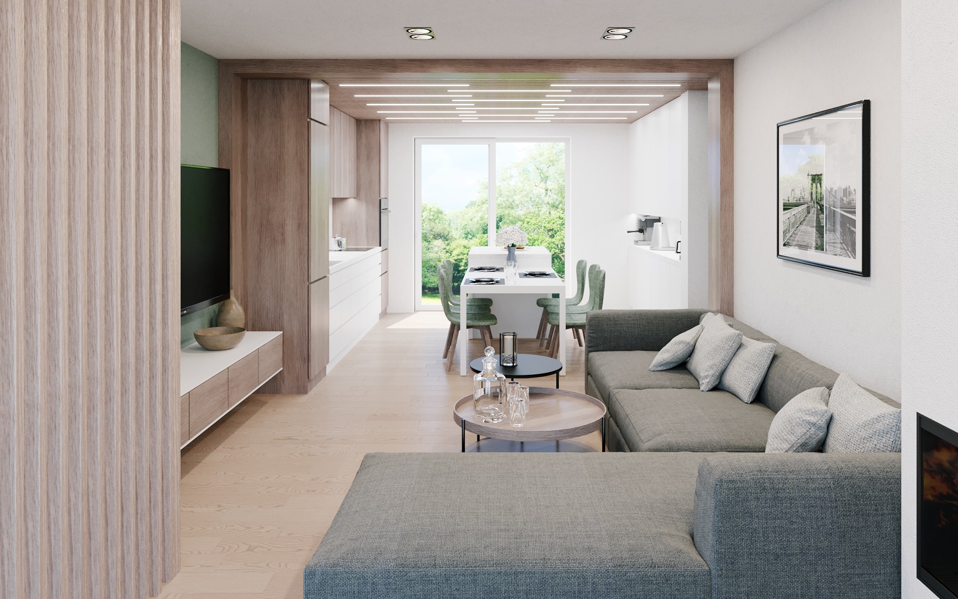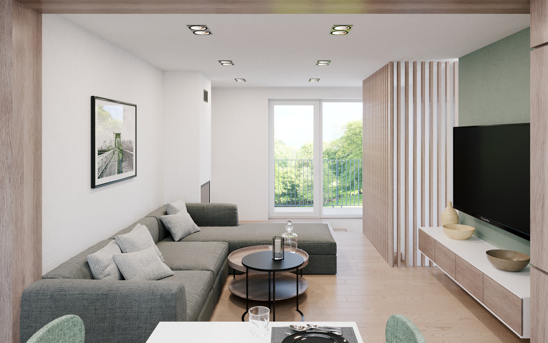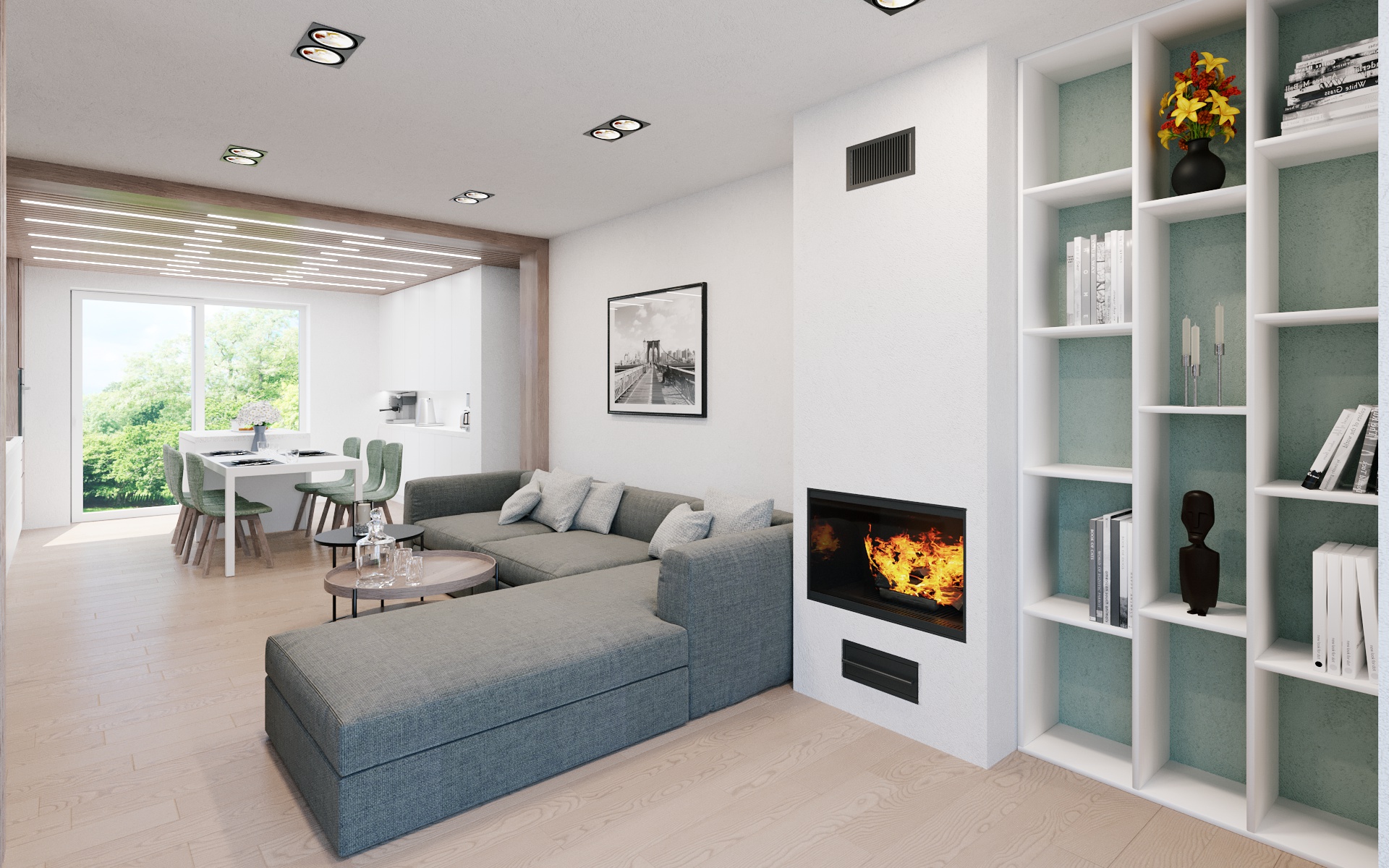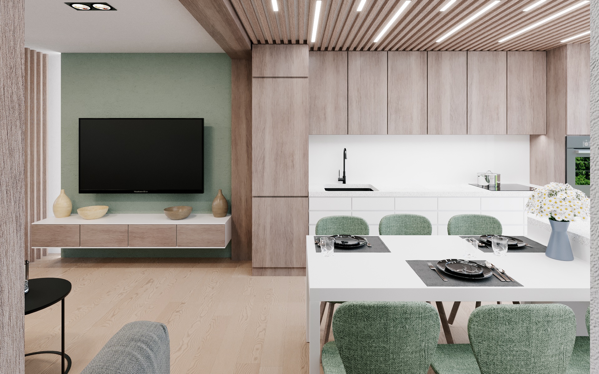 Řešená bytová jednotka bude přístupná samostatným vstupem do domu a bude nutné zbudovat nové schodiště pro propojení dvou podlaží. Projekt studie řešil vhodnou pozici schodiště a navazující prostory s důrazem na rodinný provoz v domě. Vznikl přesun kuchyně k rozlehlé venkovní terase. Na kuchyň bude plynule navazovat obývací pokoj s krbem. Schodiště bude vizuálně oddělené truhlářskou konstrukcí s dřevěnými latěmi.